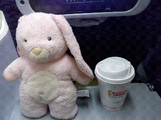 Jackie's friend Flopsey the Bunny has stowed away on the trip to Mexico. After being frisked by the TSA she is all checked in on the plane to Houston. The plane smells like a porto john. Flopsey is greatful for the Dunkin Donuts coffee that is masking the smell.